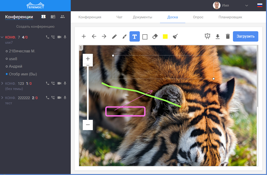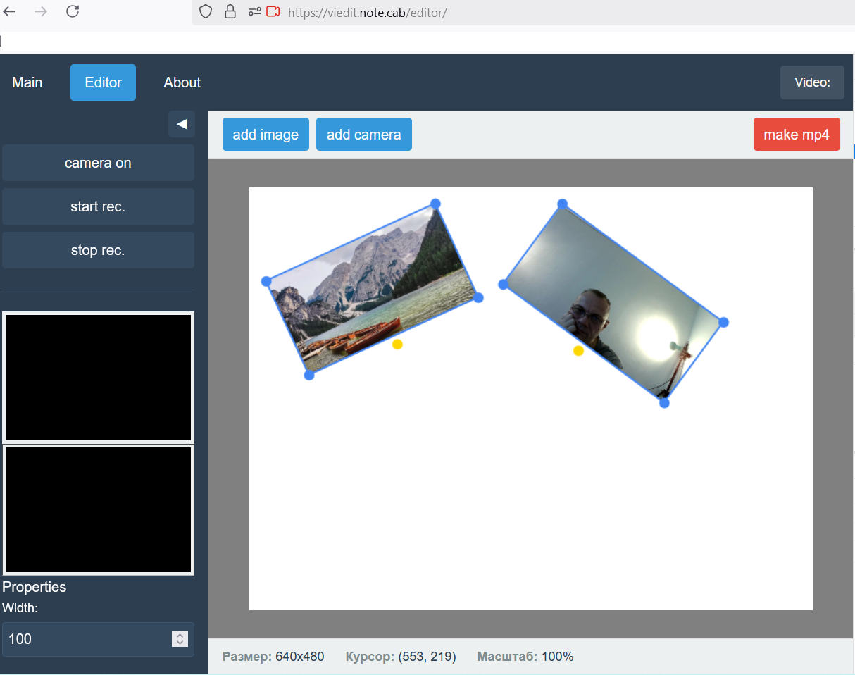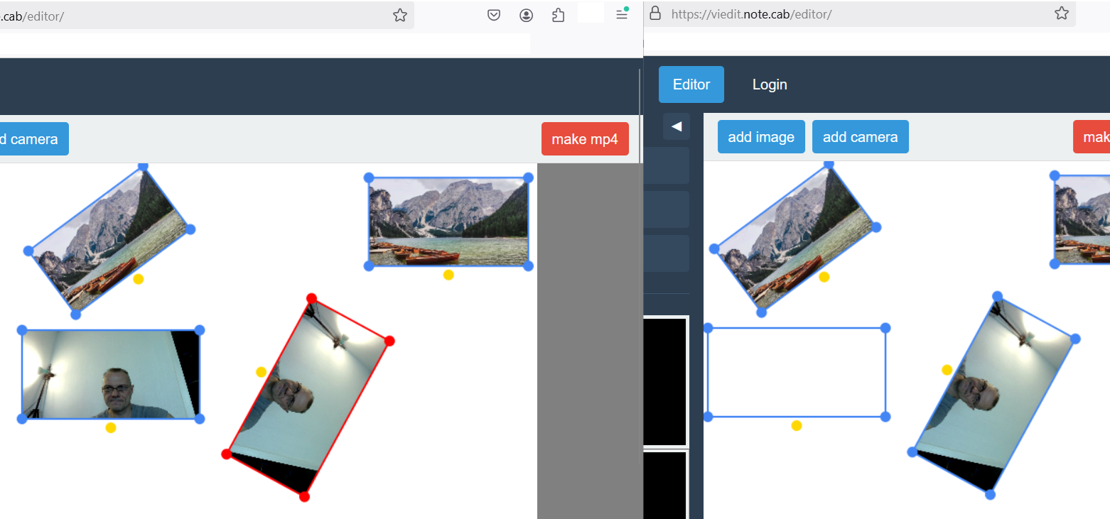 Подробное описание находится по ссылке http://viedit.note.cab/about, но можно отдельно пояснить момент, что на первом скрине ниже видно, что в одном браузере человек, разместивший фигуру CameraBox, включил трансляцию (при этом рамка стала красной), поэтому у другого человека в другом браузере в соответствующем дубле CameraBox появилось изображение с камеры первого человека. А на второй фигуре CameraBox первый человек трансляцию не включил, поэтому у второго человека в соответствующем CameraBox изображения нет.