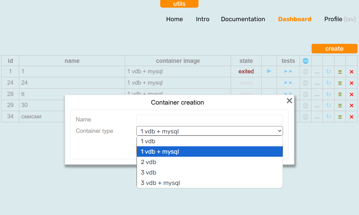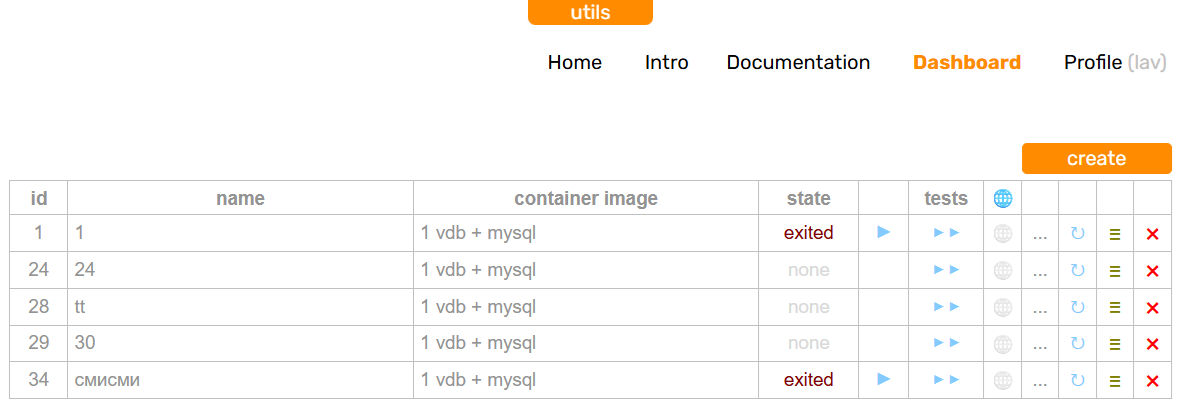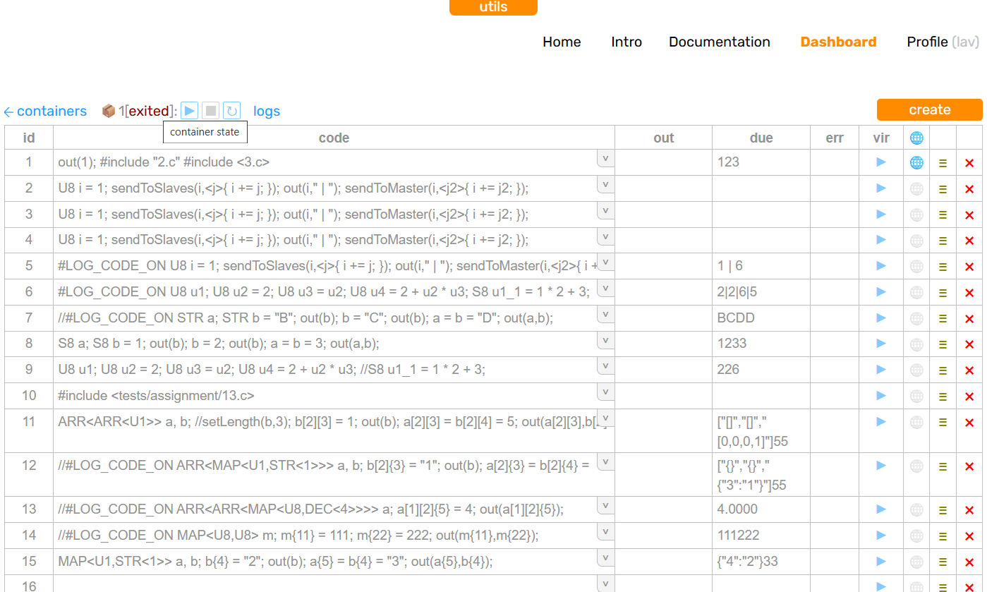 - также сайт имеет возможность делать свои страницы с контейнерами и тестами, выполняемыми в них, публичными. Что позволяет другим пользователям наблюдать за чужими тестами.