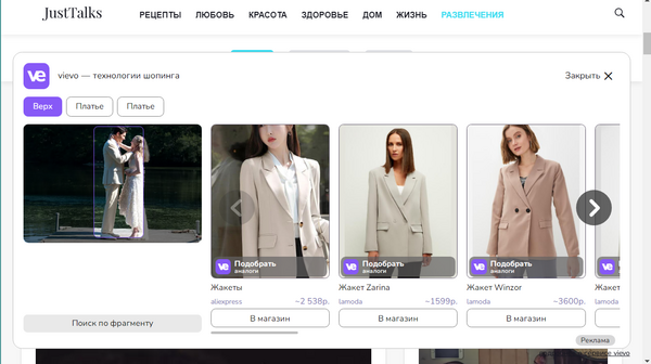 Это продолжение идеи "Система онлайн-шопинга", описанной выше, распространить технологию распознавания товаров на изображениях и предложение их покупки на любые изображения на сайтах. Мой скрипт, после его установки на сайт партнера, парсил изображения, отправлял их на сервер, который возвращал список товаров. После этого мой скрипт рядом с картинками рисовал разные красивые анимированные кнопки, при нажатии на которые во всплывающем окне повлялся "мини-сайт" с предложениями реальных товаров аналогичных тем, что на изображениях сайта.